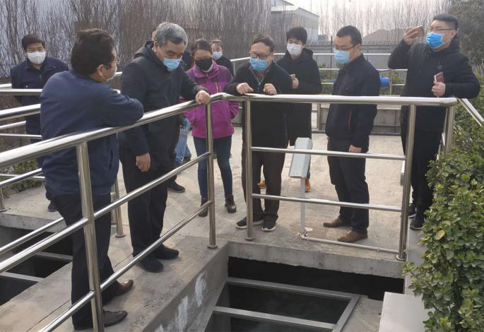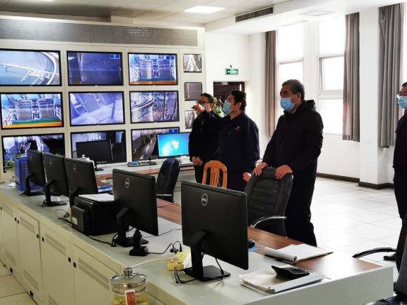 检查组一行首先来到中心控制室、预处理系统、污泥板框车间、出水口等生产一线,实地查看各处理单元的运行情况,随后又巡视了公司疫情防控点、办公场所与食堂等重点部位,详细听取了总经理原建光有关疫情防控期间企业生产运行、防控机制、员工排查、设施物资、内部管理等方面的情况汇报。